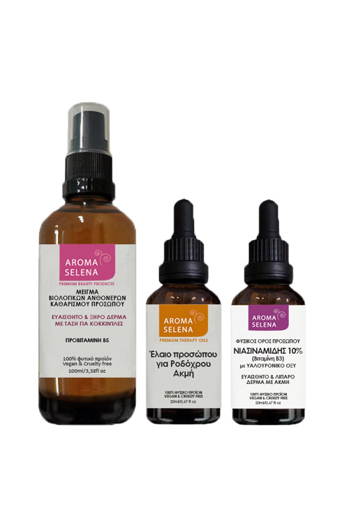 Τα τρία προϊόντα Aroma Selena που προτείνουμε, ρυθμίζουν την ευαισθησία, τις κοκκινίλες, την λιπαρότητα και την έκκριση σμίγματος στο πρόσωπο, ενυδατώνουν και καθαρίζουν το δέρμα και επουλώνουν τα σημάδια ακμής και τις κοκκινίλες που προέρχονται από αυτήν.